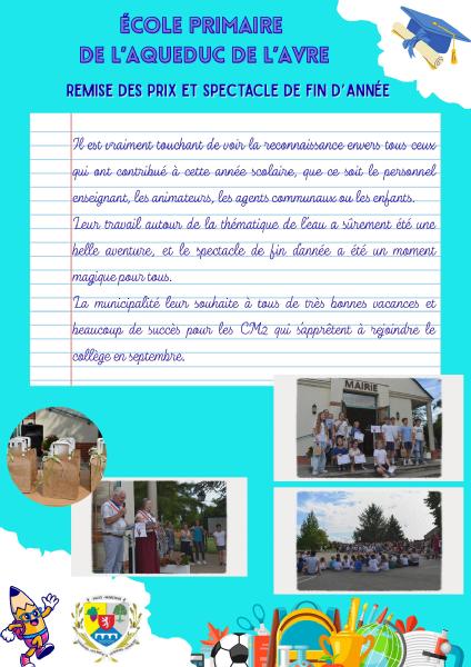 A l'issu de ce spectacle, les CM2 ont reçu une récompense pour fin du cycle primaire. Cette récompense a été remis en présence de monsieur le Maire Jacques Chaumette.